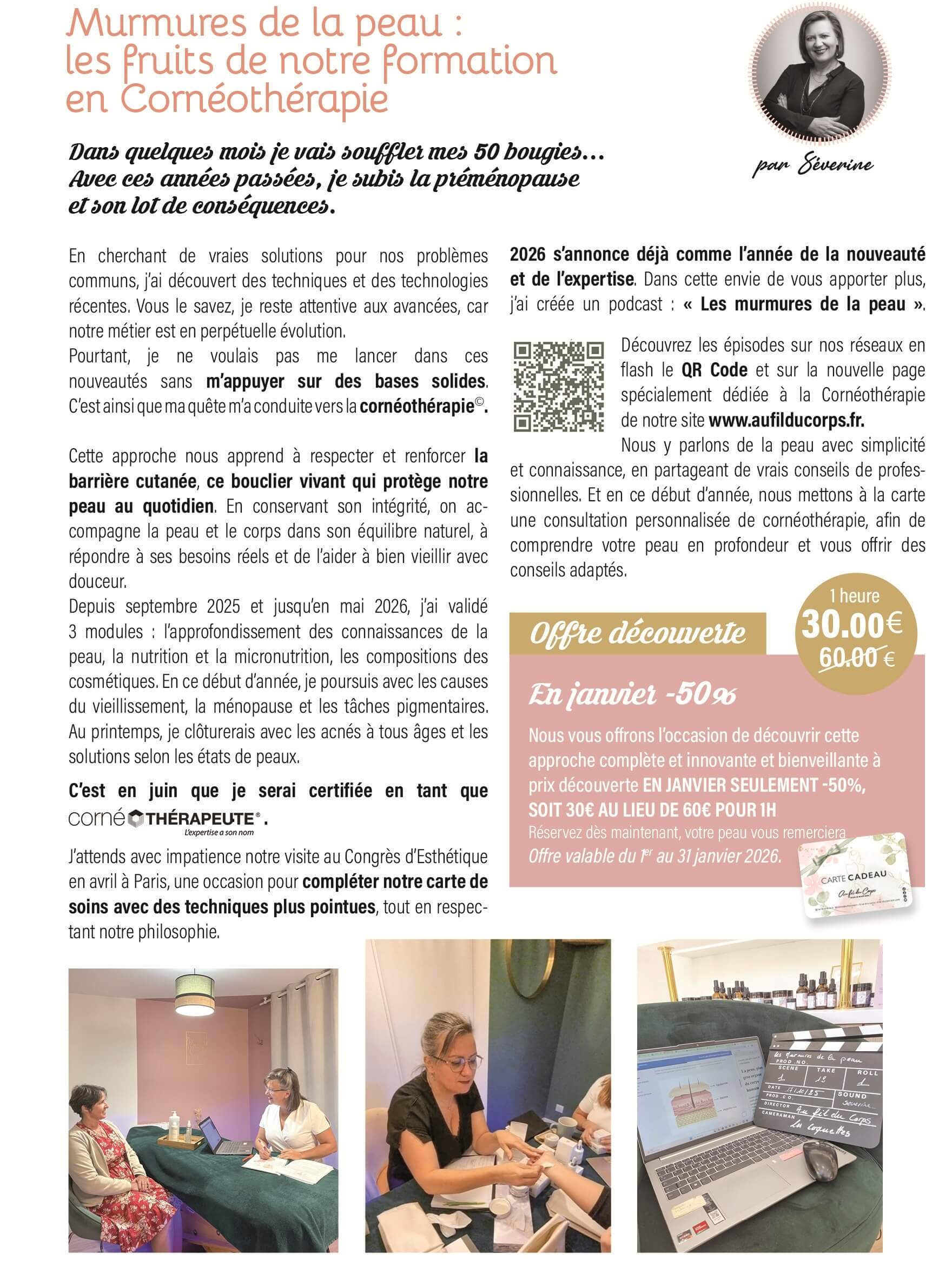 Séverine poursuit sa formation en cornéothérapie, une approche qui place la barrière cutanée au cœur de la santé de la peau. Cette vision guide désormais nos choix et nos soins, pour vous accompagner avec encore plus de précision et de bienveillance.