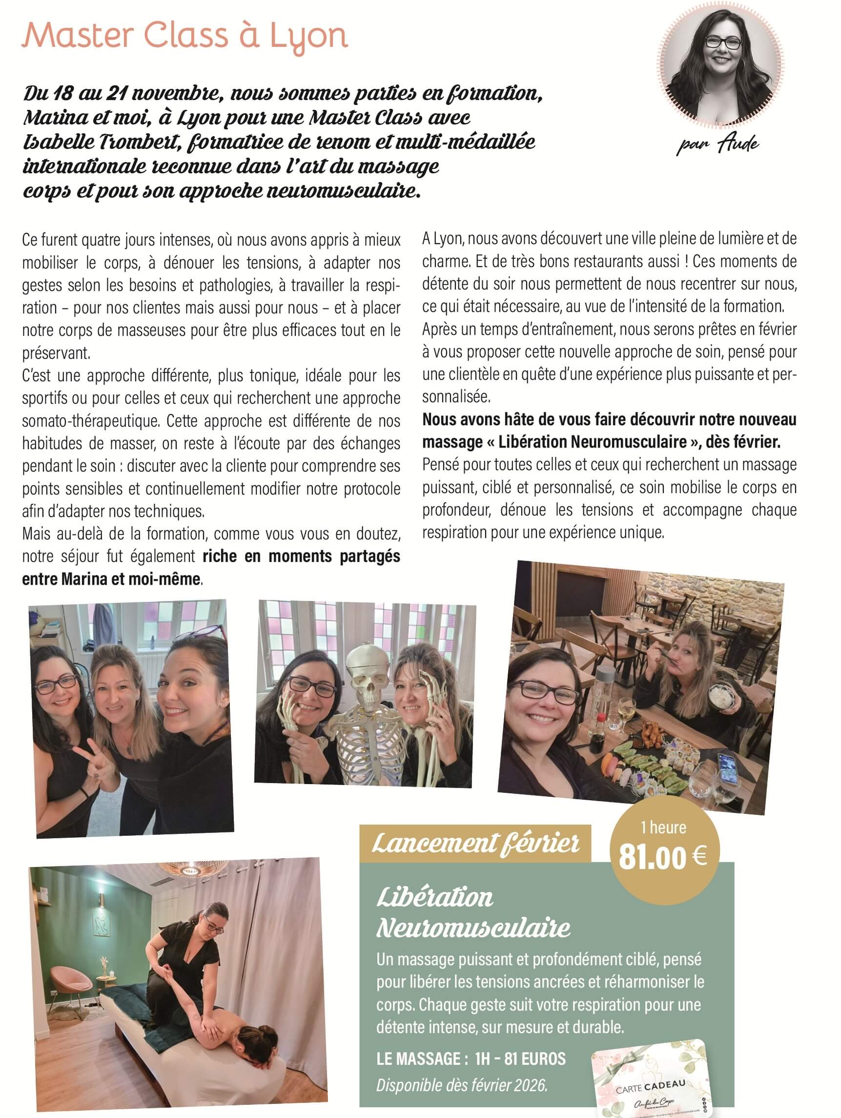 Aude et Marina reviennent d’une Master Class intense à Lyon, où elles ont perfectionné une approche neuromusculaire du massage, apportant une nouvelle dimension à nos soins du corps.